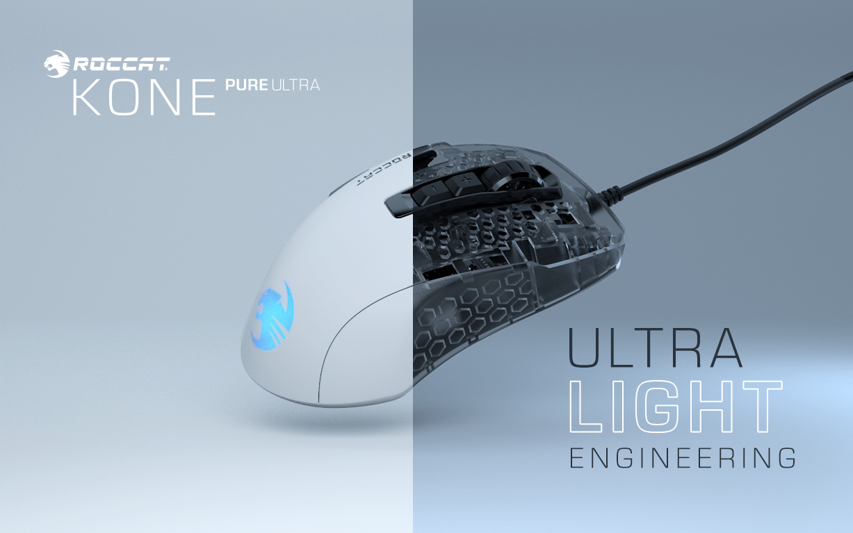 Kone Pure Ultra 是業界首創的符合人體工程學的超輕鼠標。僅重66 克,堪稱同類最輕鼠標之一。特別配備最新高端ROCCAT Owl-Eye 16,000dpi 光學傳感器。同時採用專門研發的表面塗層,具備極其出色的抓握控制,經久耐用。