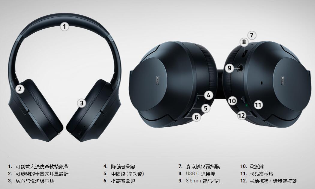 - 內含:耳麥、高級便攜盒、機上轉接頭、1.5 公尺長的 3.5mm 類比耳機線、30 公分長的 USB-C 轉 USB-C 轉接線、USB-A 轉 USB-C 轉接器