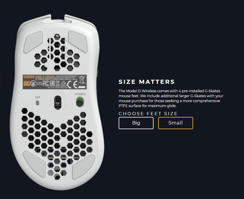 Say goodbye to shoddy stock mouse feet and hello to the silkiest skates on the market. The included Glorious G-Skates allow the Model D Wireless to effortlessly float across your mousepad with their rounded, snag-proof design and 100% pure virgin PTFE composition. 0.81mm thickness for long-lasting durability.