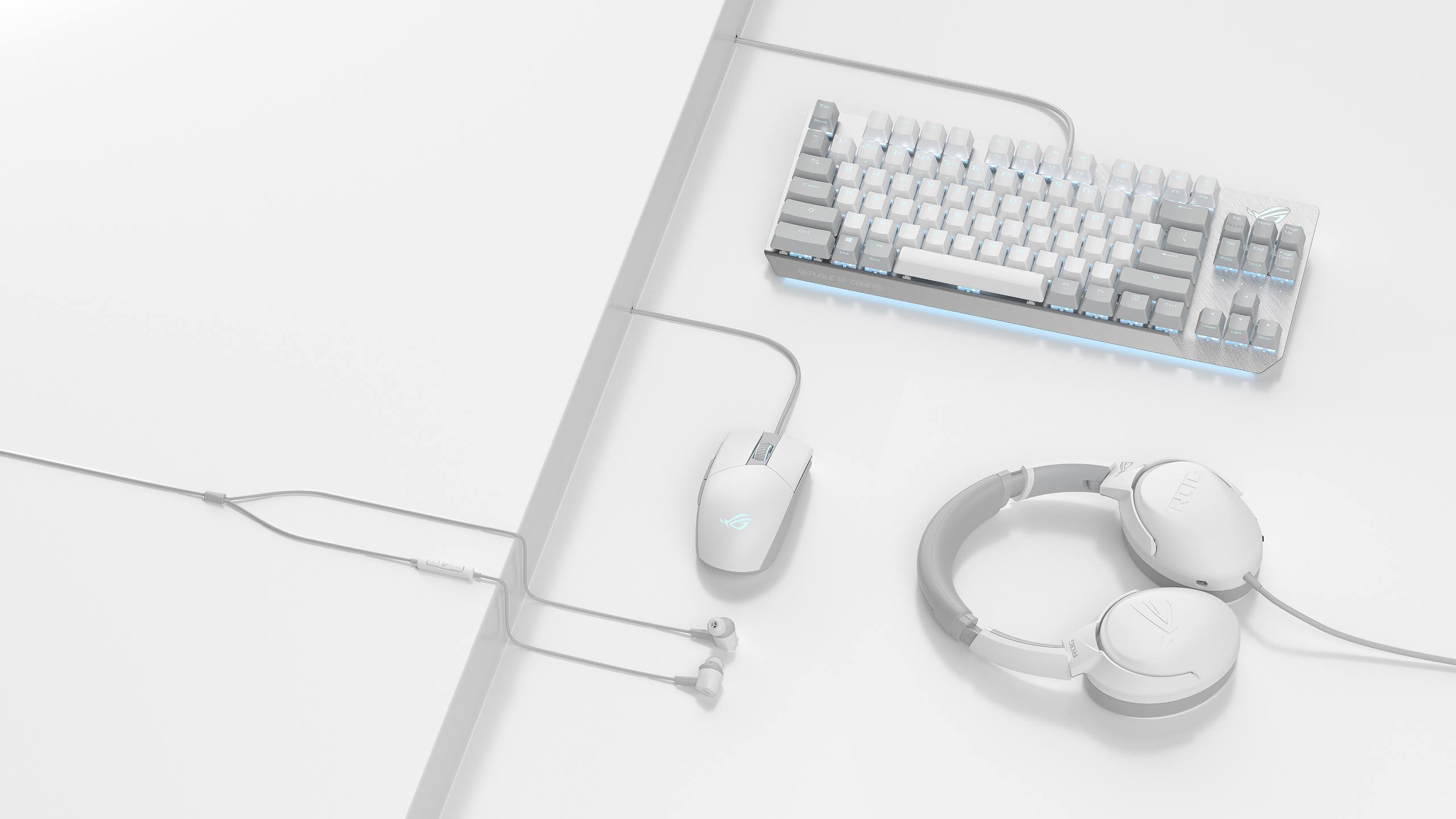 全新 ROG Moonlight White 月光系列產品,以簡潔美感的設計提供玩家多元選擇。選用月光系列的 ROG Strix Scope NX TKL 鍵盤、Strix Impact II 光學滑鼠、Strix Go Core 耳機、Cetra II Core 入耳式耳機以及 Zephyrus G14 與 G15 電競筆電,在戰場上嶄露皎潔光芒。
