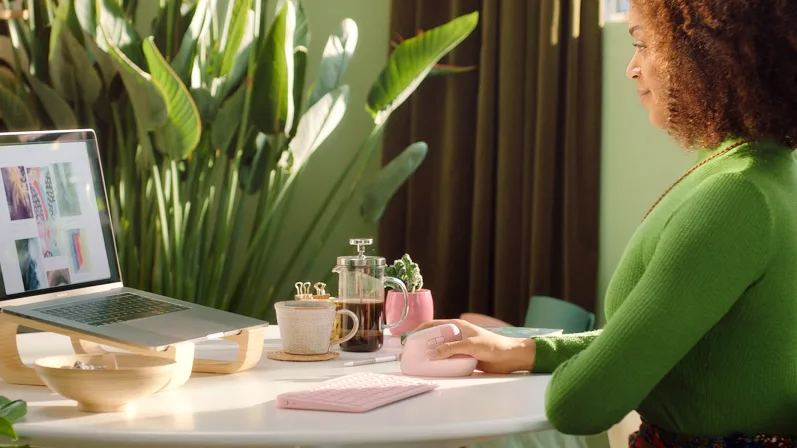 上半身更加放鬆,讓專注於思考真正重要的事情。具有安靜的咔噠點按聲音以及順暢滑動的靜音滾輪,輕輕一點就能順利操作,讓您一整天都保持心情平靜。