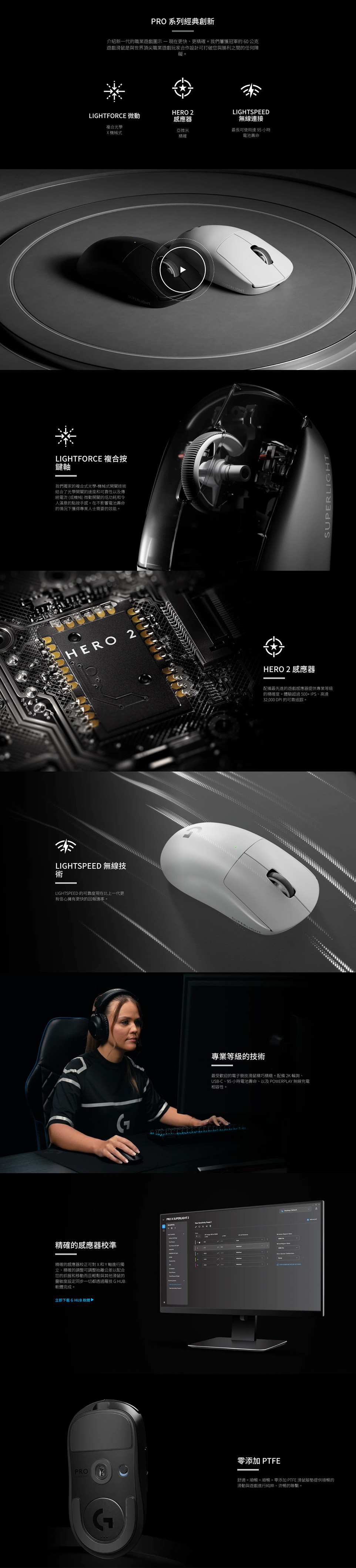 解析度: 100 - 32,000 dpi 2進階功能需要安裝羅技 G HUB 軟體,此軟體可從 logitechg.com/ghub 下載