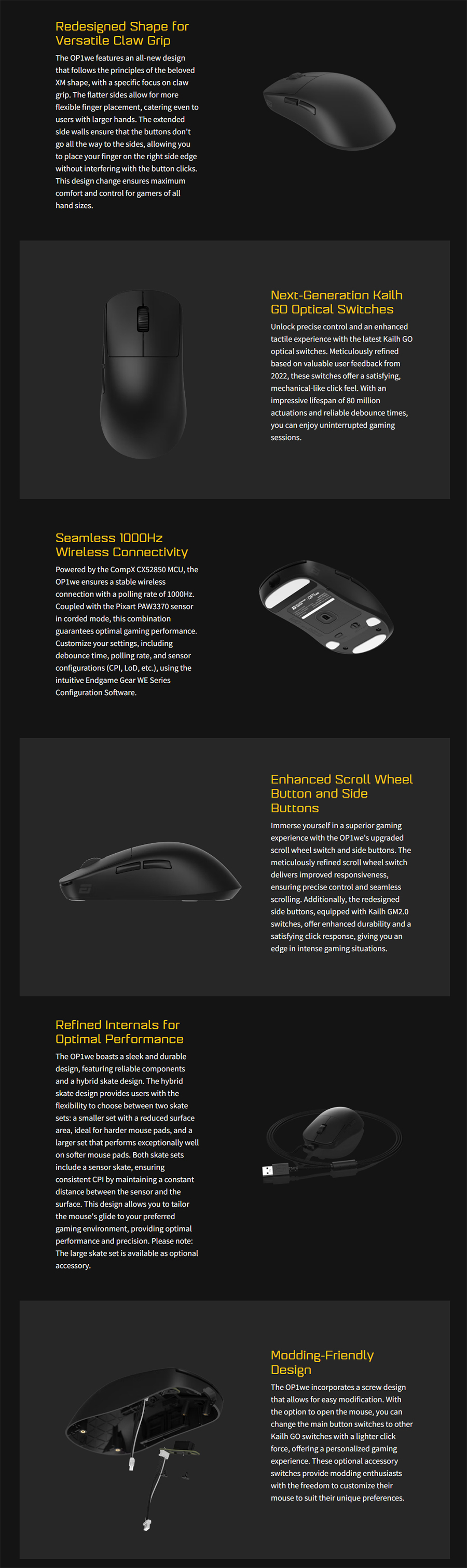 The OP1we, a new smaller mouse shape from Endgame Gear, serves as an addition to the budget-friendly 'wireless essential' lineup. It features a CompX CX52850 MCU and a PixArt PAW3370, enabling a consistent report rate of 1000Hz and swift reaction times. The Kailh GO optical switches further enhance its performance. Equipped with a 335mAh battery, the OP1we offers a week of gameplay without the need for recharging. Its modding-friendly design allows for further customisations.