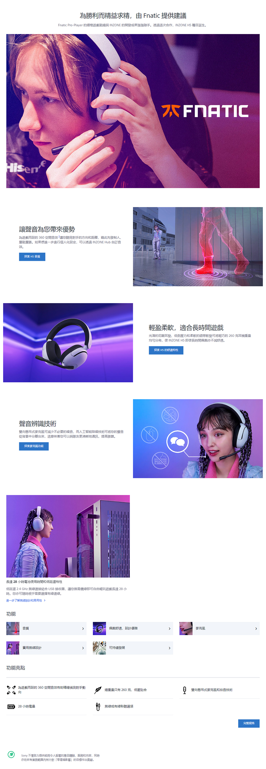 INZONE H5 體積輕巧,兩側壓力低,可應付長時間的遊戲征戰。先進的空間重現效果讓您完全沉浸其中,麥克風確保隊友能聽見您的聲音,從此順利邁向勝利。