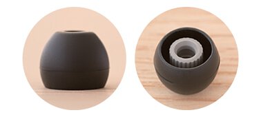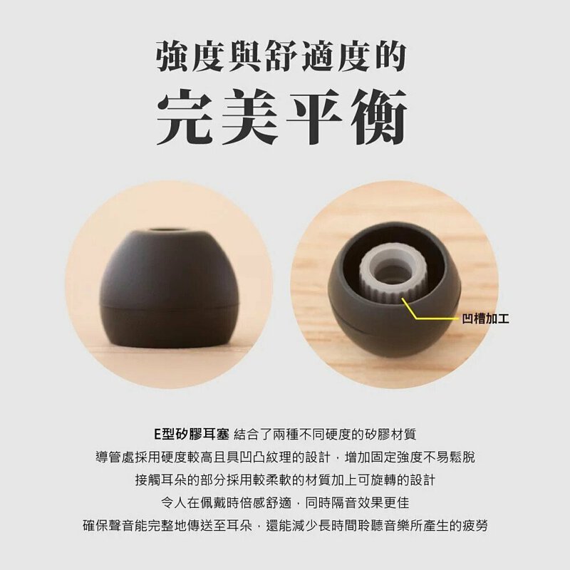 E Type 耳膠每一粒都使用了兩款不同的矽膠物料:耳機導管位置使用了較硬的、經凹槽加工的矽膠,而外部則使用了較軟身的矽膠,令配戴更舒適、隔音效果更理想。