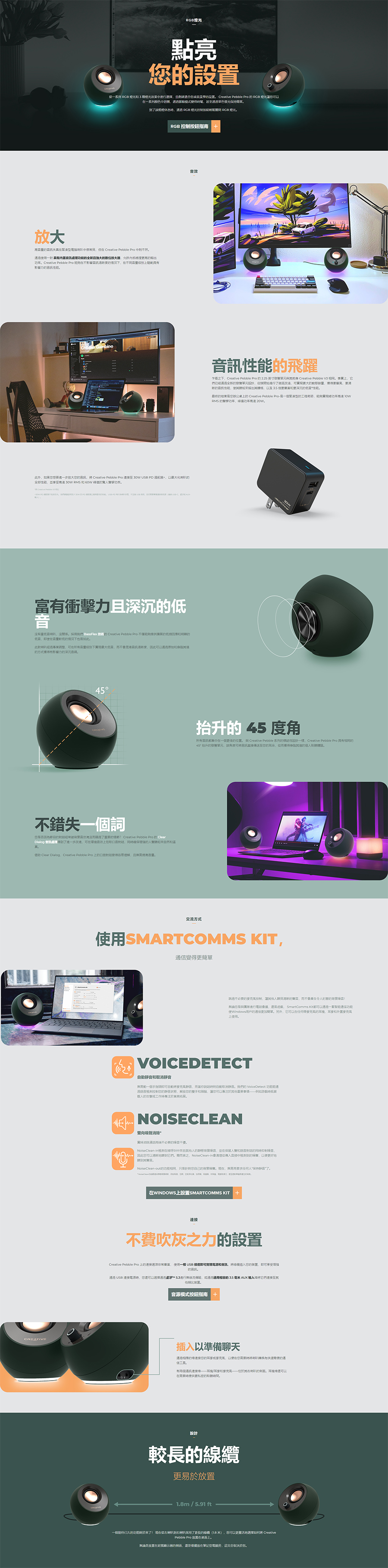 - 現在有了可定制的 RGB 燈光! Creative Pebble Pro音箱通過簡單的即插即用設置,讓您可以從多種 RGB LED 燈和三種燈光效果中進行選擇。