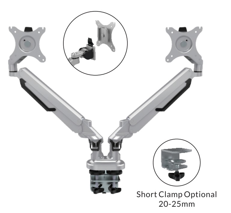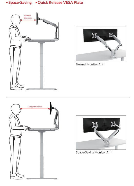 Make the most out of your workspace with the Flexispot Space-Saving Gas Spring Monitor Arm. This Monitor Arm improves work efficiency by offering more desk space, especially when working with a desk privacy panel. By using a gas spring, the MA8D v.2 offers fluid movement with the slightest touch but stays where you put it without any sagging. VESA compatible allows you to mount nearly any monitor. You can rotate, tilt, or swivel your monitors to get a perfect feel for your task at hand.