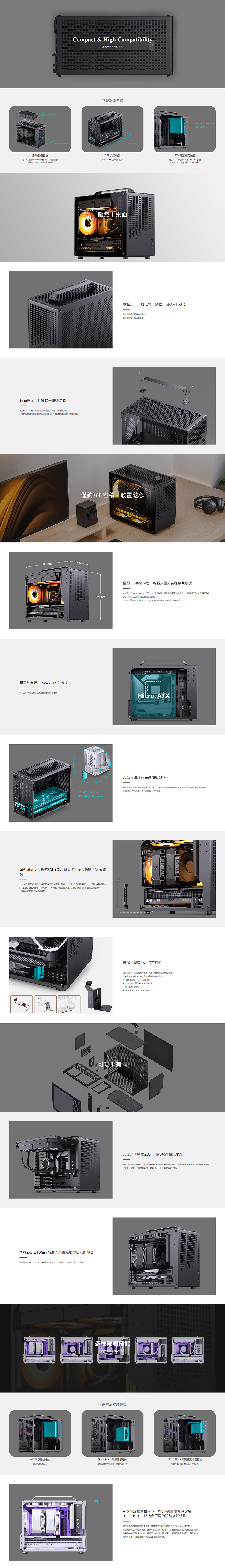 建造一台桌面緊湊型的小主機,雖充滿樂趣,但也面臨很多取捨。機箱體積縮小的同時,相容性/ 散熱/ 安裝體驗等衝突也逐步加大,因此少數具備充足經驗的使用者才具備較為明確的建構思路與裝配能力。對此,我們不斷思考如何透過優化設計,保持緊湊硬體佈局的同時,提升內部的硬體相容度,最終能讓更多用戶體驗到小型化機種的實用性與樂趣: ● 主體尺寸370mm*