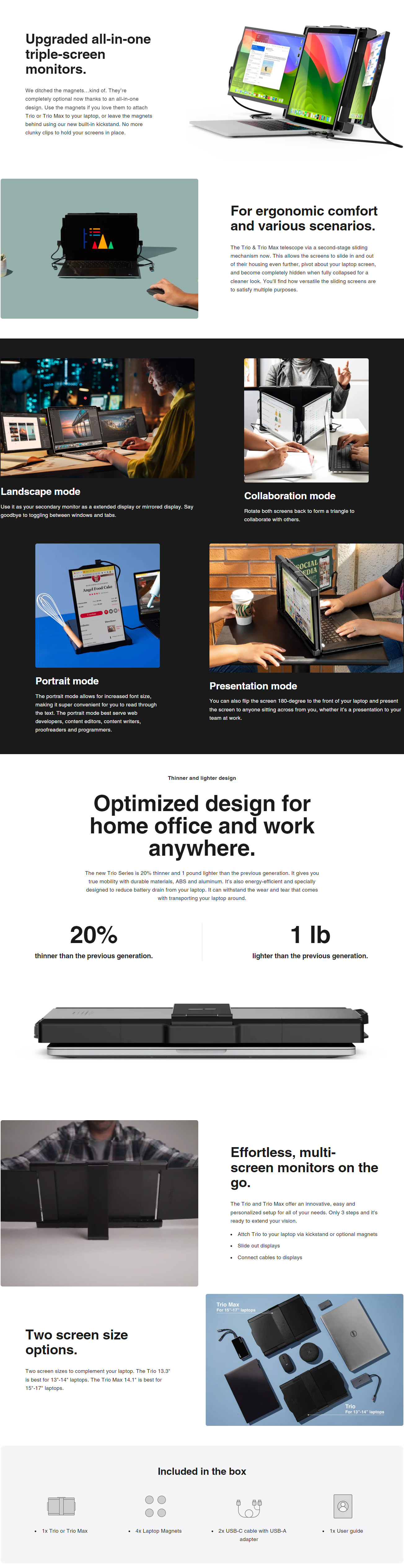 新款 Trio 和 Trio Max 是我們的升級產品,厚度減少 20%,重量減輕 1 磅,是即插即用的三屏一體顯示器。作為工作專業人士、遊戲玩家、股票交易者、企業家、編碼員等人士的終極解決方案,它隨時隨地,易於使用。