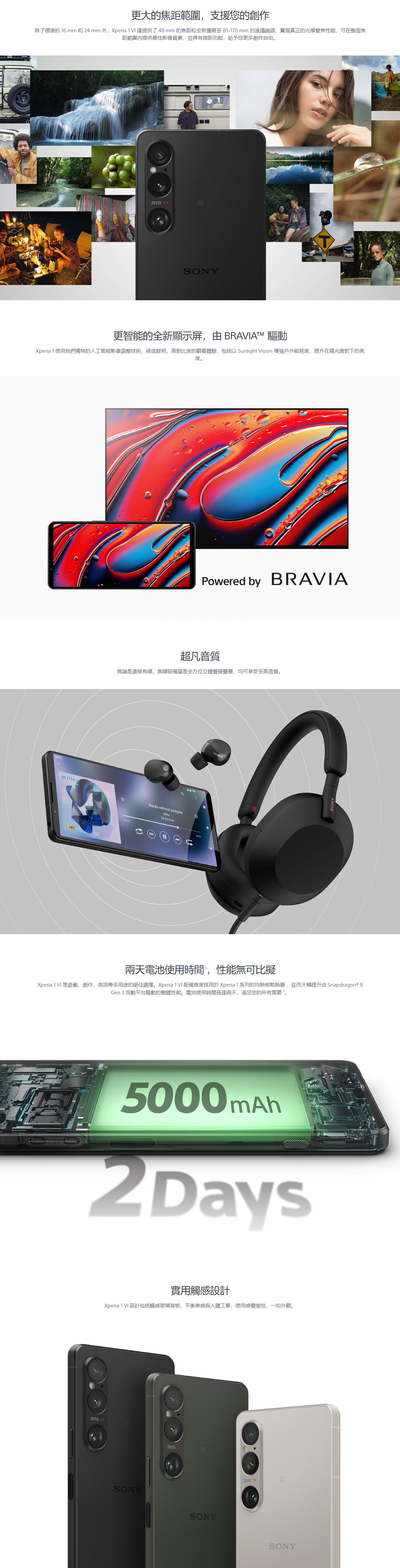 專為 Xperia 1 VI 校正的 ZEISS® 優質鏡頭、120 FPS 讀取速度、高達 30 FPS 的自動對焦/自動曝光連拍7、高達每秒 60 次的連續自動對焦/自動曝光計算8、實時眼睛自動對焦(人類、動物)9、實時追蹤10、OIS 相片11、閃光燈、補光燈、21.3 倍混合變焦(基於 24 mm 廣角相機)、HDR(高動態範圍)相片、夜間拍攝功能、創意風格