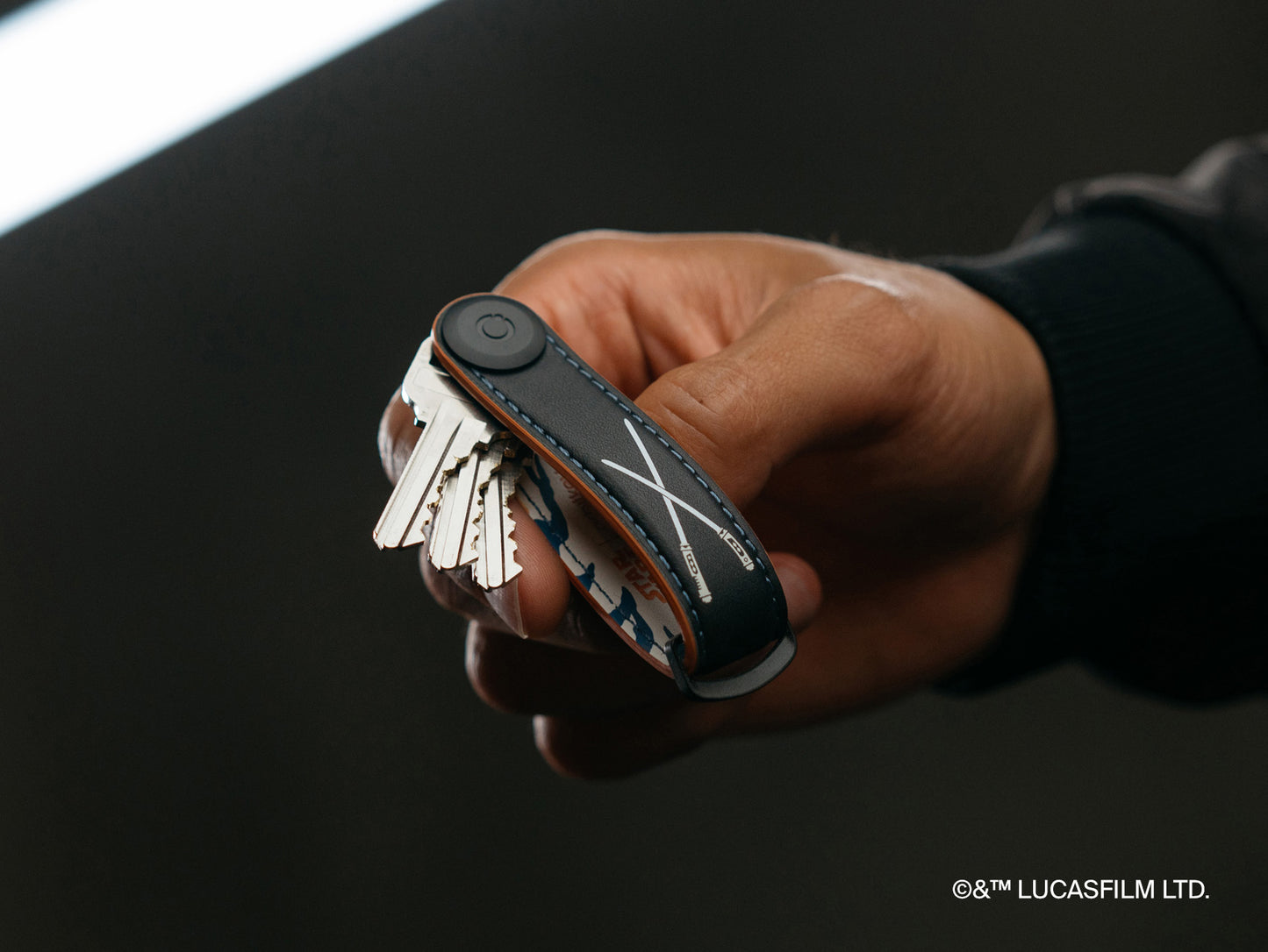 Featuring a black leather with navy stitching, orange edge lining, and white and blue stripes inner band inspired by Ahsoka™.