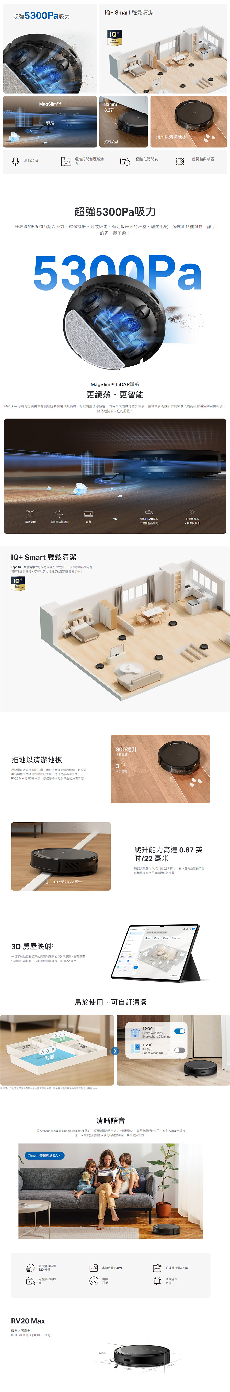 - 超強大的 5300Pa 吸力- 確保機器人有效吸走所有地板表面的灰塵、寵物毛髮、麵包屑和各種碎片,讓您的家一塵不染。