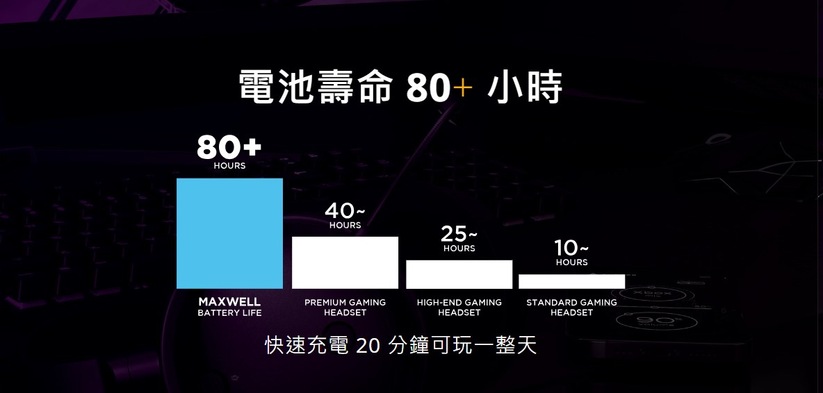 - 電池充飽可以連續使用80小時,使用快充進行充電20分鐘就足夠讓你連續使用一天。