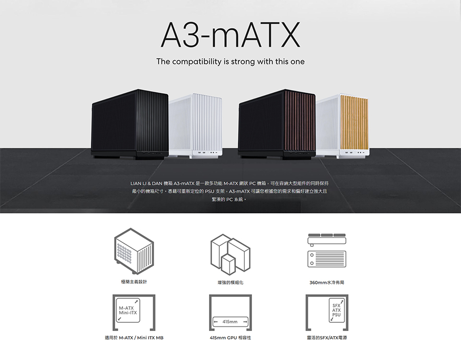 - 可容納M-ATX和ITX主機板,附4槽415mm大GPU