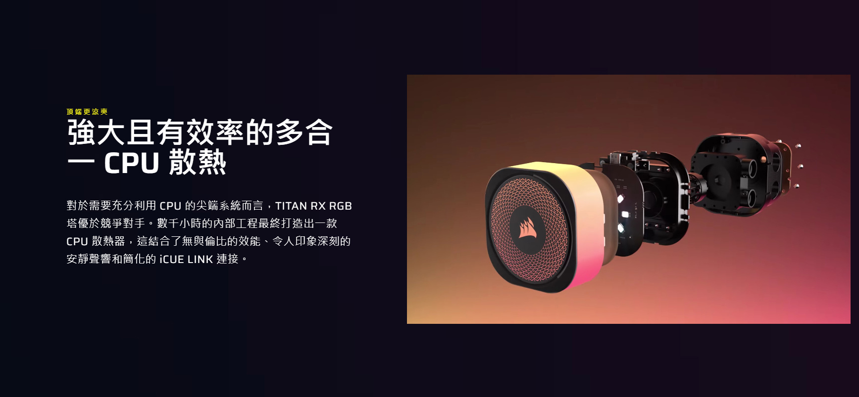 CORSAIR iCUE LINK TITAN RX RGB 以最佳化的熱性能、簡化的 iCUE LINK 連接能力和動態 RGB 燈光,提供高效能、超安靜的散熱效果。