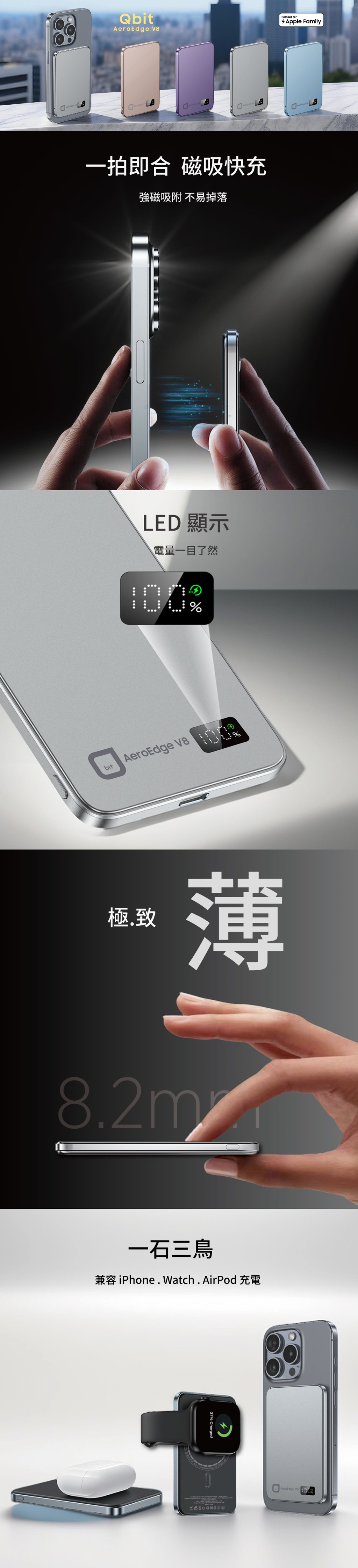 - 超薄磁吸設計,一拍即充,LED 顯示電量。