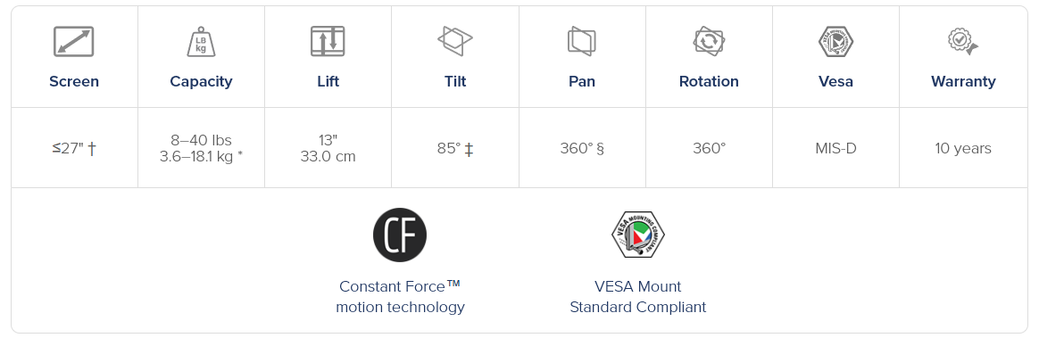 * Weight Capacity: Individual monitor weight = 4–20 lbs (1.8–9 kg). Total weight capacity = 8–40 lbs (3.6–18.1 kg). Monitor depth greater than 3.6" (9 cm) may diminish capacity