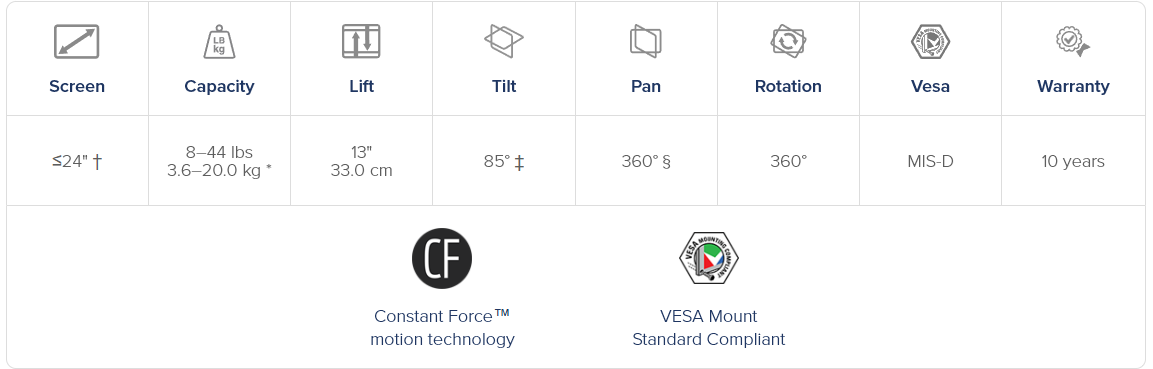 * Weight Capacity: Individual monitor weight = 4–22 lbs (1.8–10 kg). Total weight capacity = 8–44 lbs (3.6–20 kg). Monitor depth greater than 3.6" (9 cm) may diminish capacity
