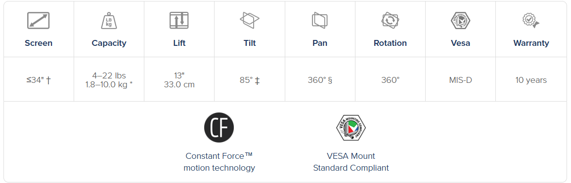 * Weight Capacity: display = 4 to 22 lbs (1.8 to 10 kg); keyboard ≤ 5 lbs (2.2 kg). Display depth greater than 3.6" (9 cm) may affect weight capacity