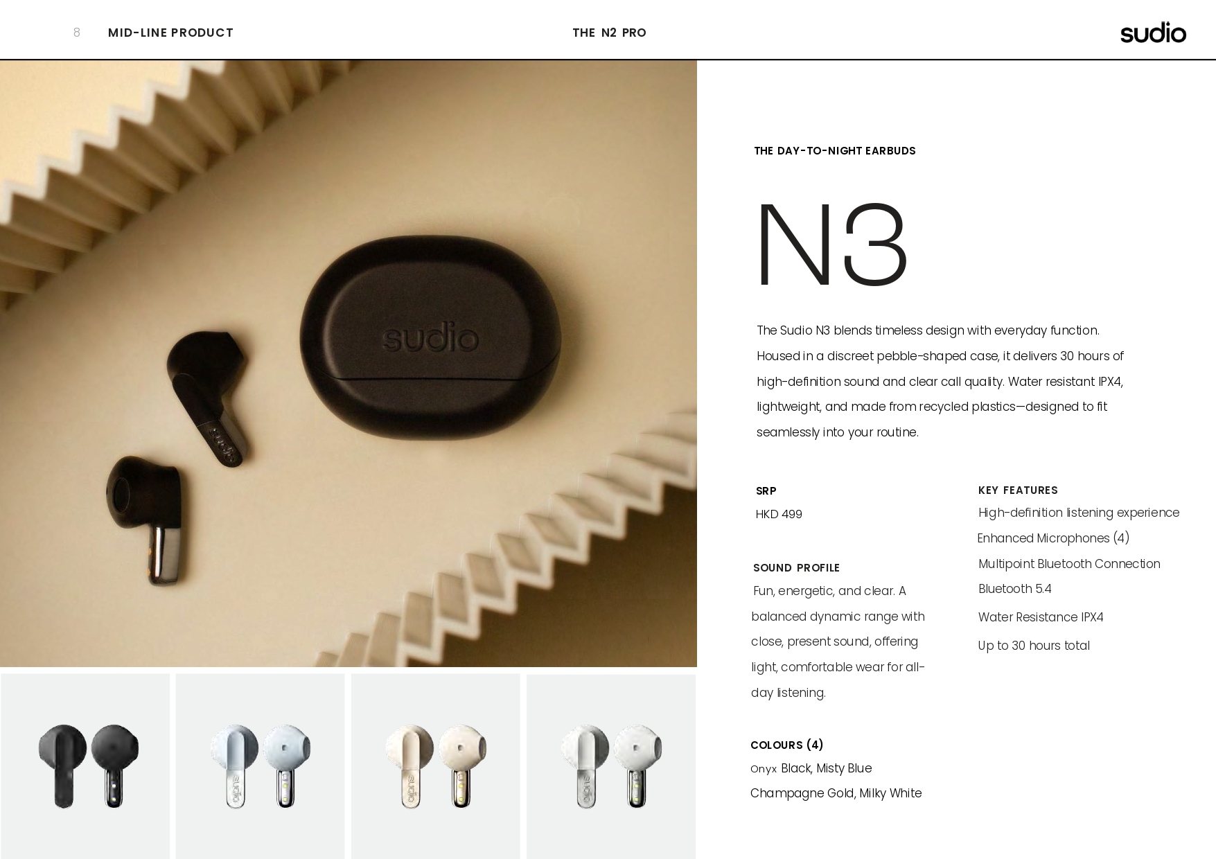 The Sudio N3 blends timeless design with everyday function. Housed in a discreet pebble-shaped case, it delivers 30 hours of high-definition sound and clear call quality. Water resistant IPX4, lightweight, and made from recycled plastics—designed to fit seamlessly into your routine.