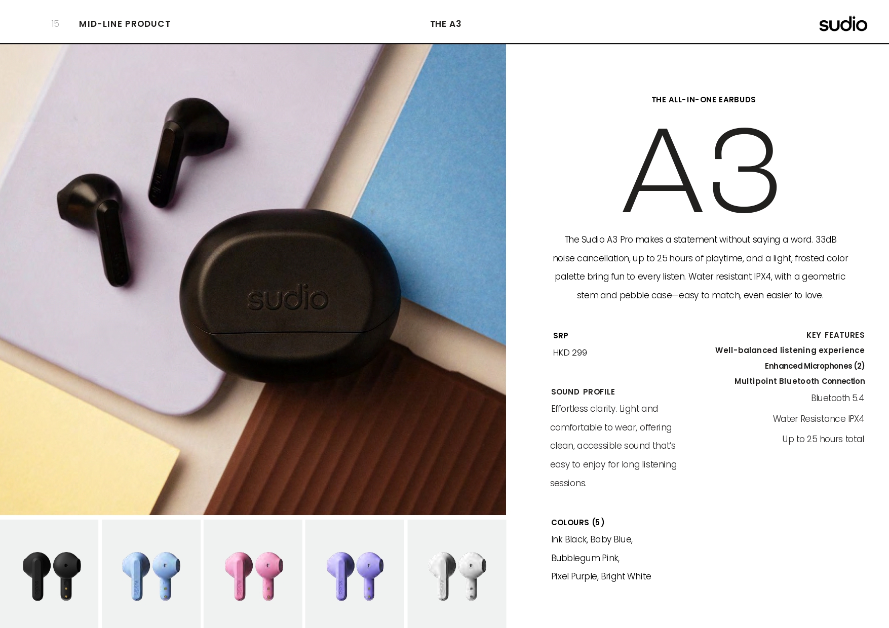 The Sudio A3 brings color, energy, and effortless sound to your everyday. It's a playful piece to your everyday life, multipoint bluetooth connection, and enhanced microphones for crisp calls, it's as easy to match as it is to love—water-resistant IPX4, with 25 hours of playtime.