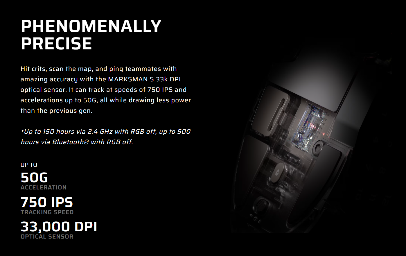 - MARKSMAN S 33K 感測器:高達 33,000 DPI,提供精準追蹤。