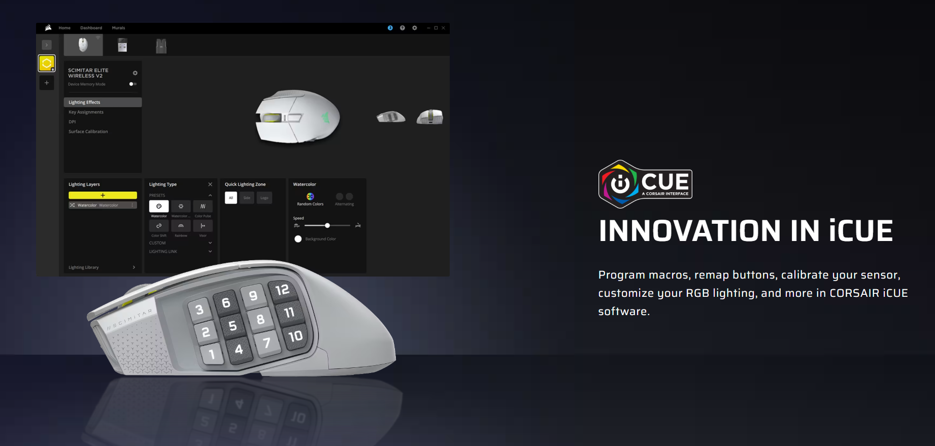 - iCUE 軟體支援:可設定巨集、重新映射按鈕、校準感測器及自訂 RGB 燈光。