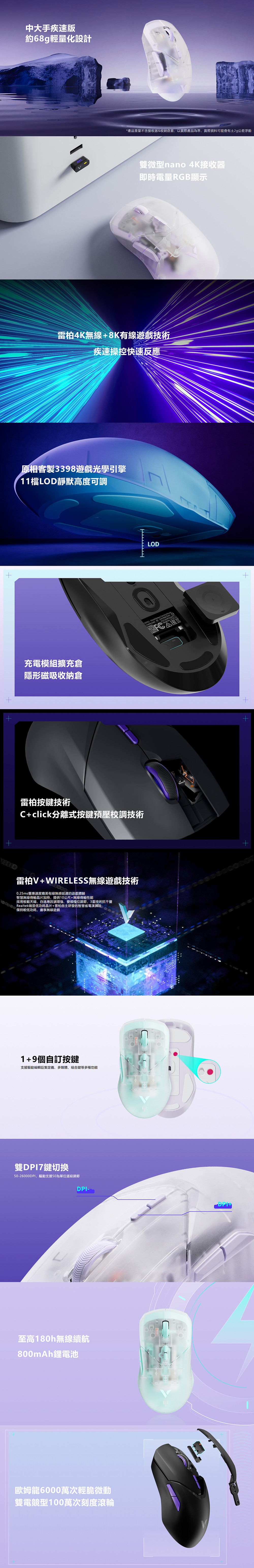1-2mm 11檔LOD靜默高度可選,50-26000DPI靈敏度,650IPS追蹤速度,50G加速度