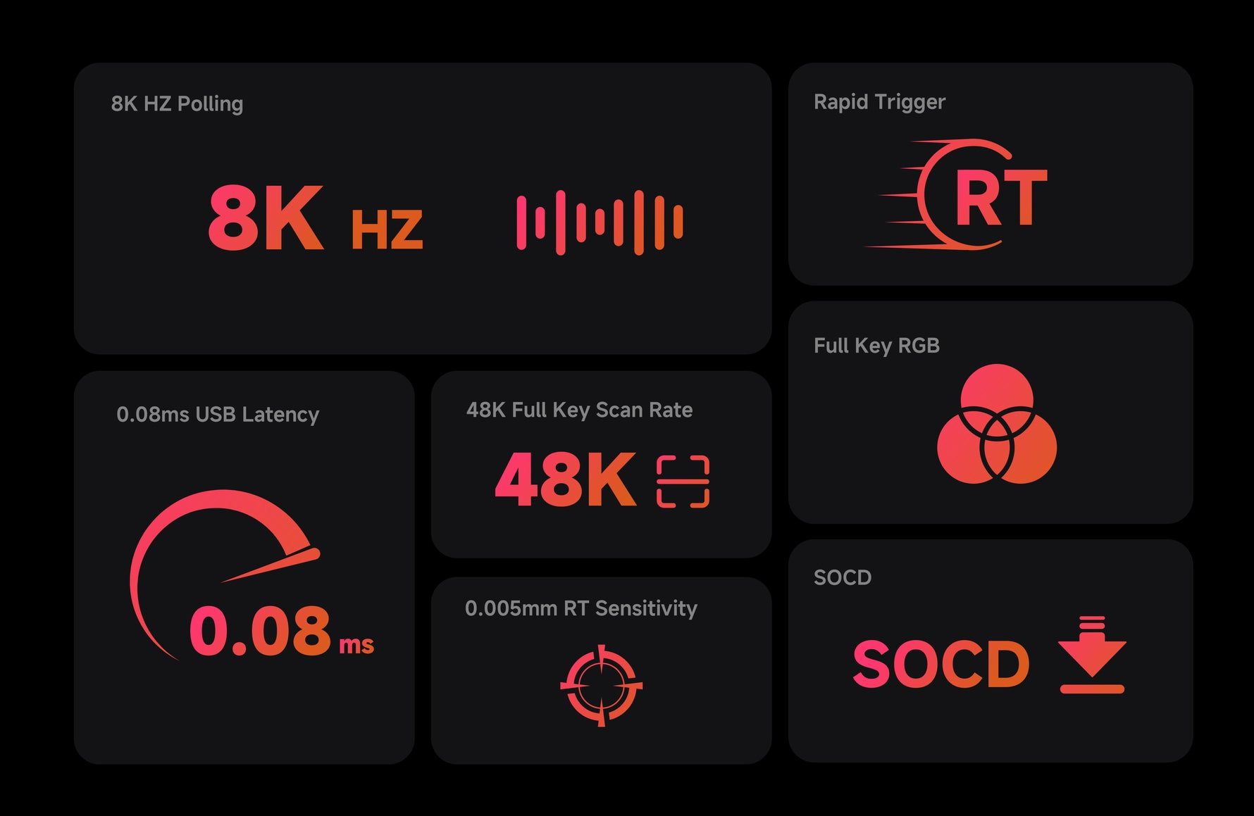 • 極速回報率:8000Hz 輪詢率,USB 延遲低於 0.125ms,實現 0.08ms 超低延遲輸入