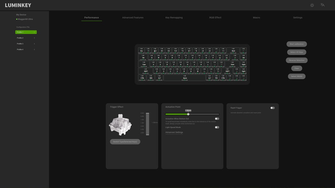 • 可調觸發點:每鍵 0.1~3.5mm,0.1mm 精度自訂