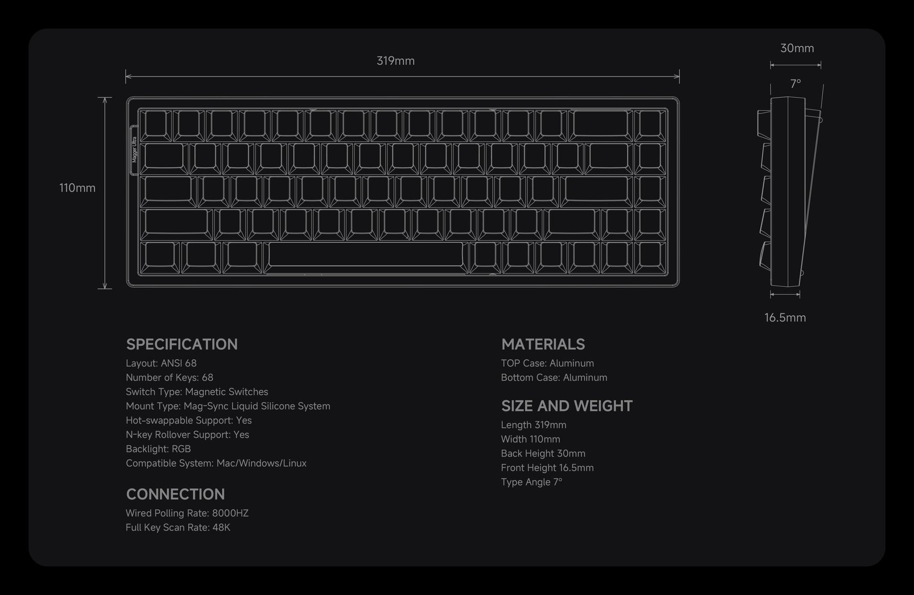 • 鍵帽與語系:PBT / PC 材質,熱昇華印字,68 鍵 ANSI 配列