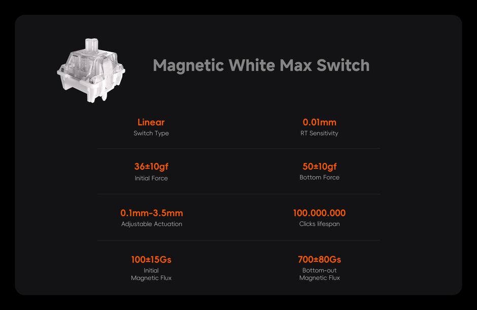 • 磁軸技術:搭載 Gateron Magnetic White Max(Plus 版)或 Magnetic Jade Pro(Ultra 版)軸體,支援 4 段動作設定與 RT 快速觸發功能