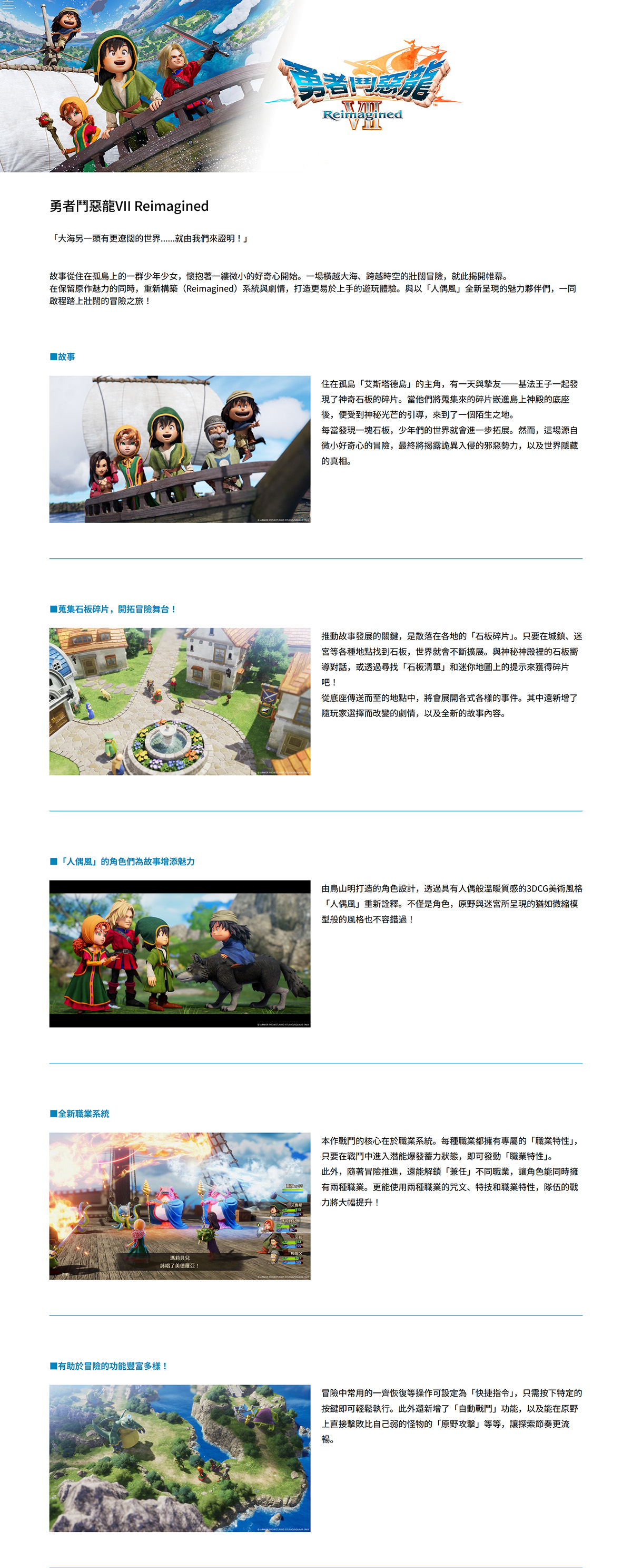 《勇者鬥惡龍 7 Reimagined》是將 2000 年在初代 PlayStation 平台發售的日本國民 RPG《勇者鬥惡龍》系列第七代作品《勇者鬥惡龍 7》以充滿手工感的 3DCG 重新構築的完全重製作品。這場源自居住在孤島上的少年少女微小好奇心的旅程,最終將成為穿梭於過去與現在的冒險,逐漸揭露邪惡勢力以及世界的真相。