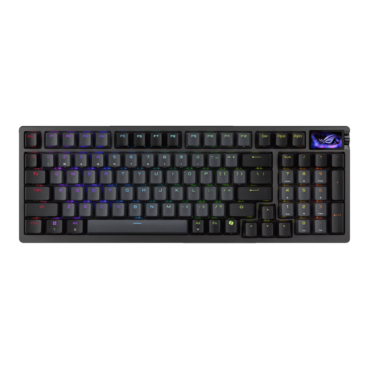 ROG Azoth 96 HE 類比遊戲鍵盤,配備可熱插拔 ROG HFX V2 磁性開關及 ROG 霍爾感測器;具備 OLED 顯示螢幕、三向旋鈕、三模連接支援 ROG SpeedNova 8K 無線技術、區域模式、六層減震設計以及可拆卸矽膠手腕托。