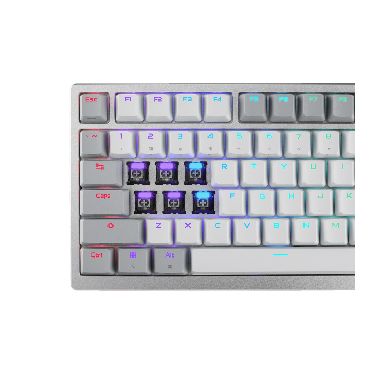 - 墊片安裝與六層減震設計:四層 PORON® 材質、一層 IXPE 墊以及矽膠墊,確保柔軟打字手感,吸收振動與開關噪音;墊片柔軟度可透過更換底層減震泡棉進行調整。