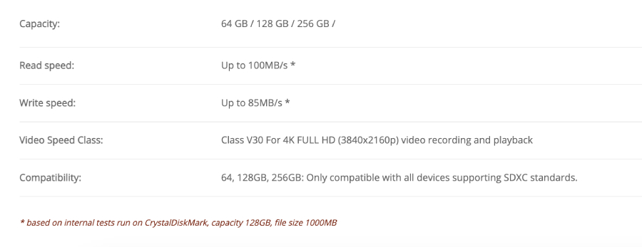- Up to 256GB storage capacity: Because 4K videos and raw shooting pictures not only require significant higher write and read performances, but also higher space on the card.