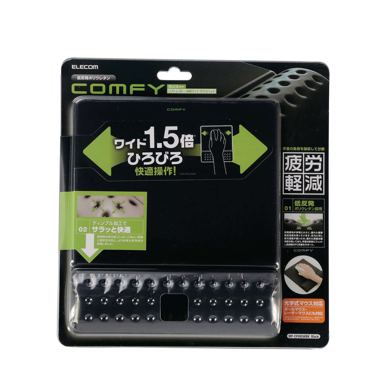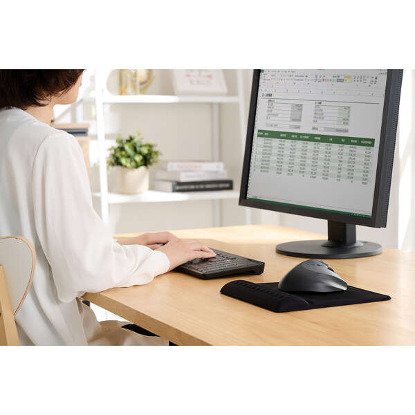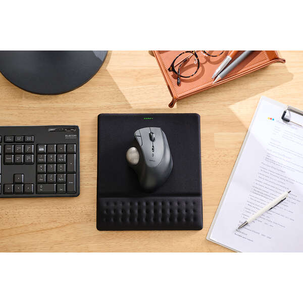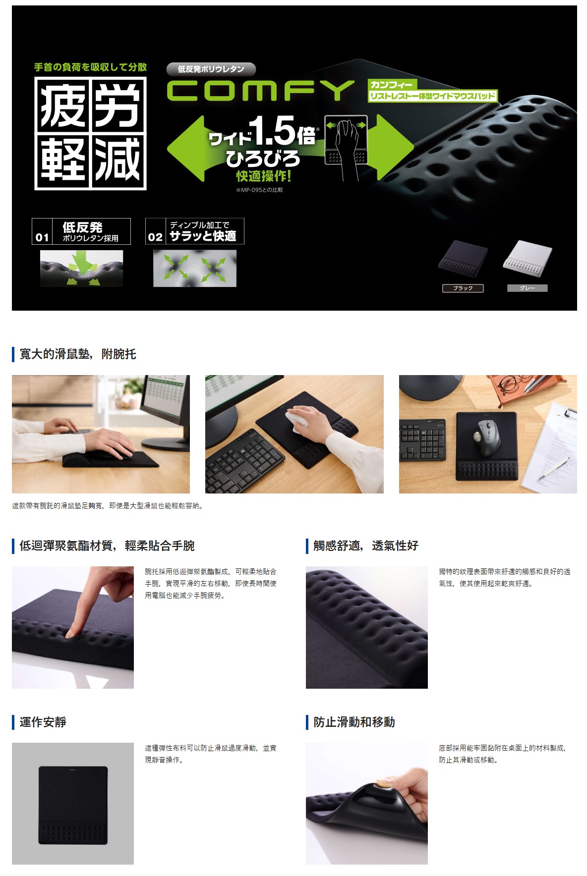 ELECOM COMFY 一體式護腕寬版滑鼠墊,專為長時間電腦操作設計。寬版尺寸可容納大型滑鼠而不會超出墊面,護腕部分採用低反發聚氨酯材質,能柔軟貼合手腕,減輕疲勞。滑鼠操作面具備適度硬度,提供輕快順暢的滑動感。底面防滑材質能牢固貼合桌面,避免滑動或位移。