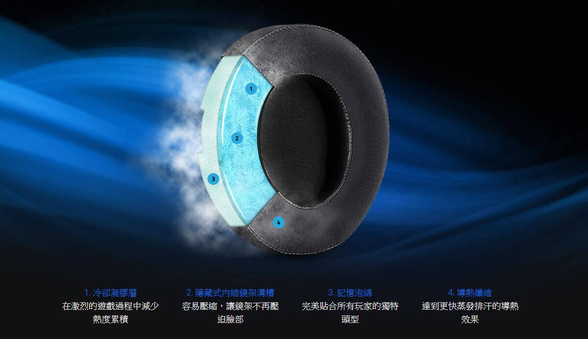 - 橢圓形耳墊:為注入冷卻凝膠的全耳覆蓋式設計,適合長時間舒適配戴