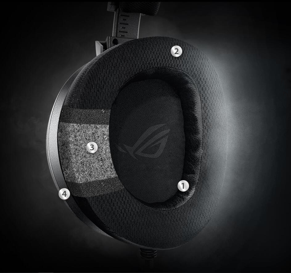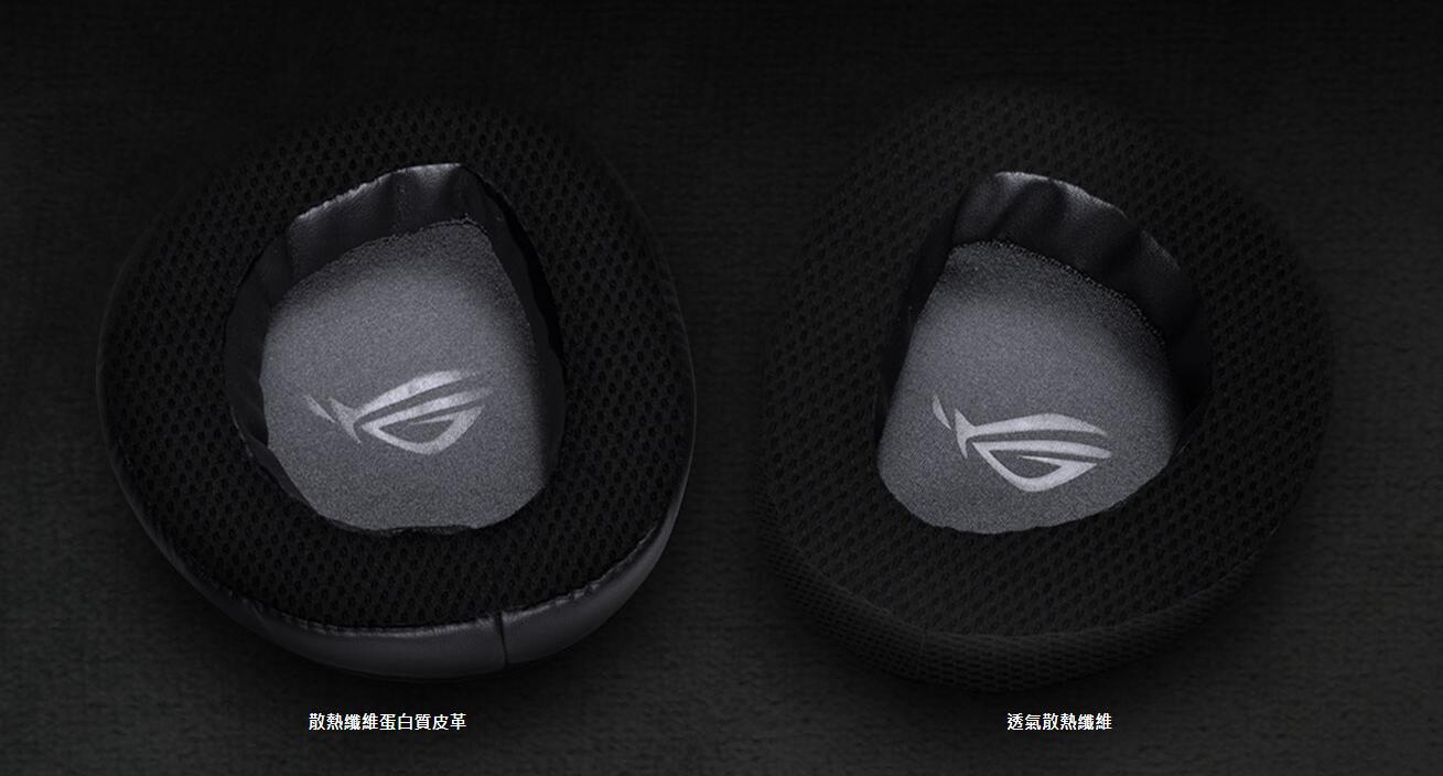 - ROG Hybrid 耳罩為反 D 型,採用特殊快速散熱纖維,且為佩戴眼鏡者貼心設計,提供毫無壓迫感的舒適性