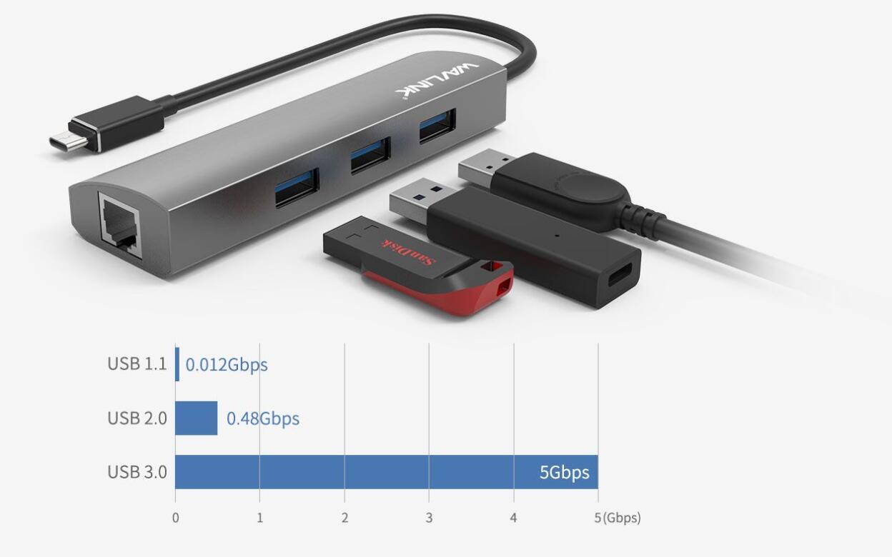 - 3 down-stream ports support transfer rates up to 5Gbps.