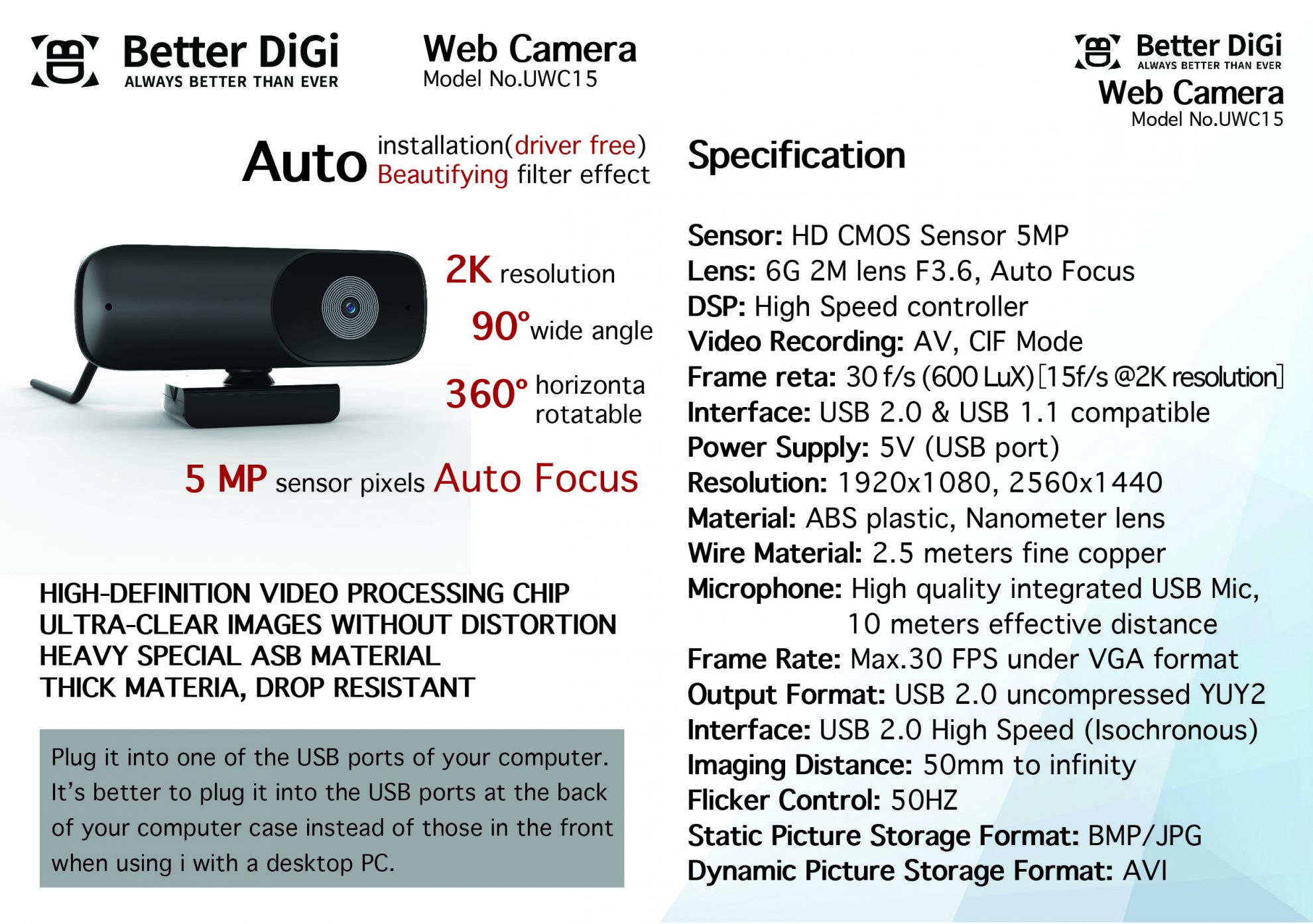 Better Digi智能2K網絡攝像頭配備了(OMNI Directional)麥克風,可濾除背景噪音,在10英尺距離處拾取語音,非常適合在線教學,博客,會議,實時流媒體,視頻通話,社交遊戲。