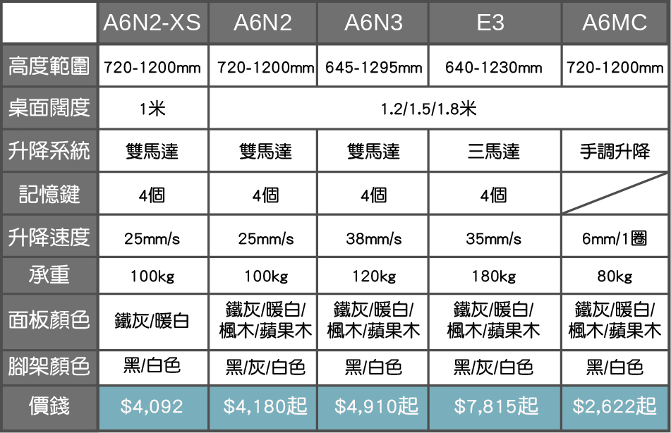 - 高度範圍: 700mm – 1160mm(不包括桌面)
