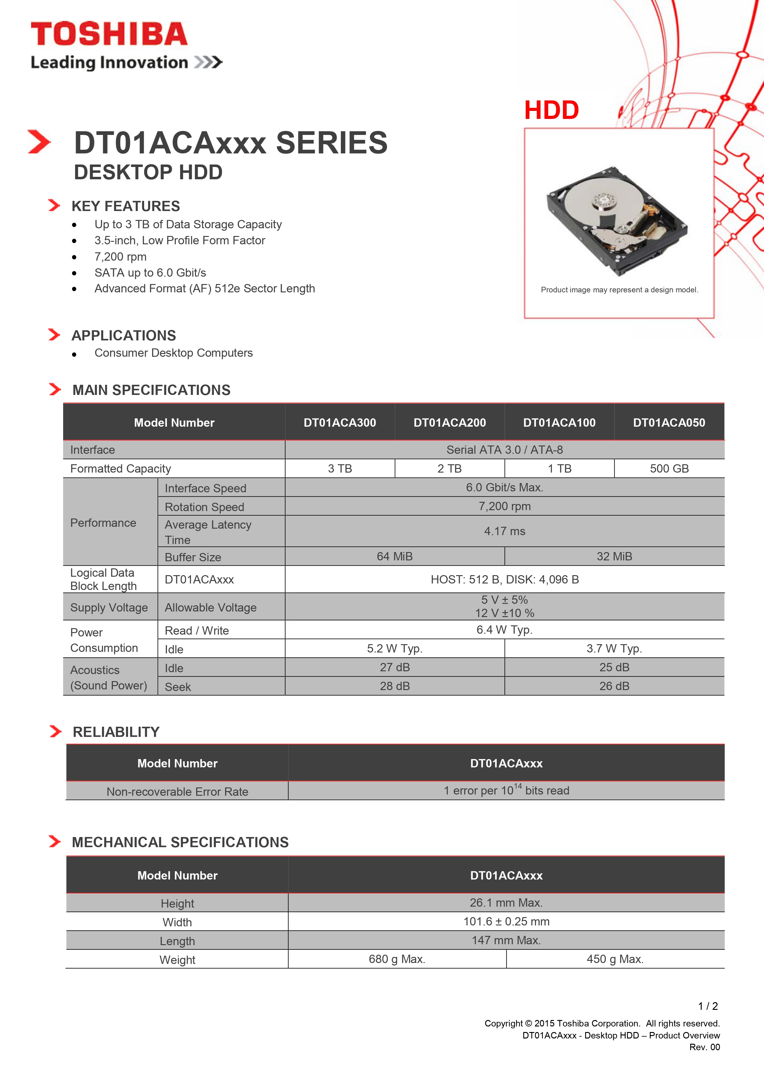 Toshiba 3.5 Internal HDD 1TB /7200rpm/Cache 32MB(DT01ACA100)