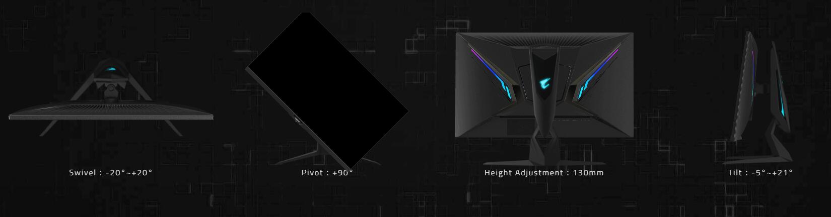 AORUS 電競顯示器採用無段式的支架,符合人體工程學設計,提供各種高度、傾斜度、擺動角度和旋轉等多重調節,讓玩家獲得最舒適的觀看品質。