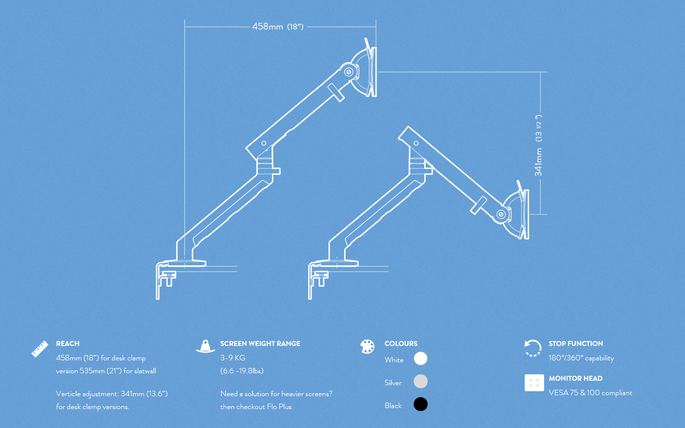 As the market leader in its class, Flo is more environmentally friendly, better looking, and a better performing product than any of its competitors. With great design and great performance, Flo offers a range and ease of movement that sets it apart from all other monitor supports.