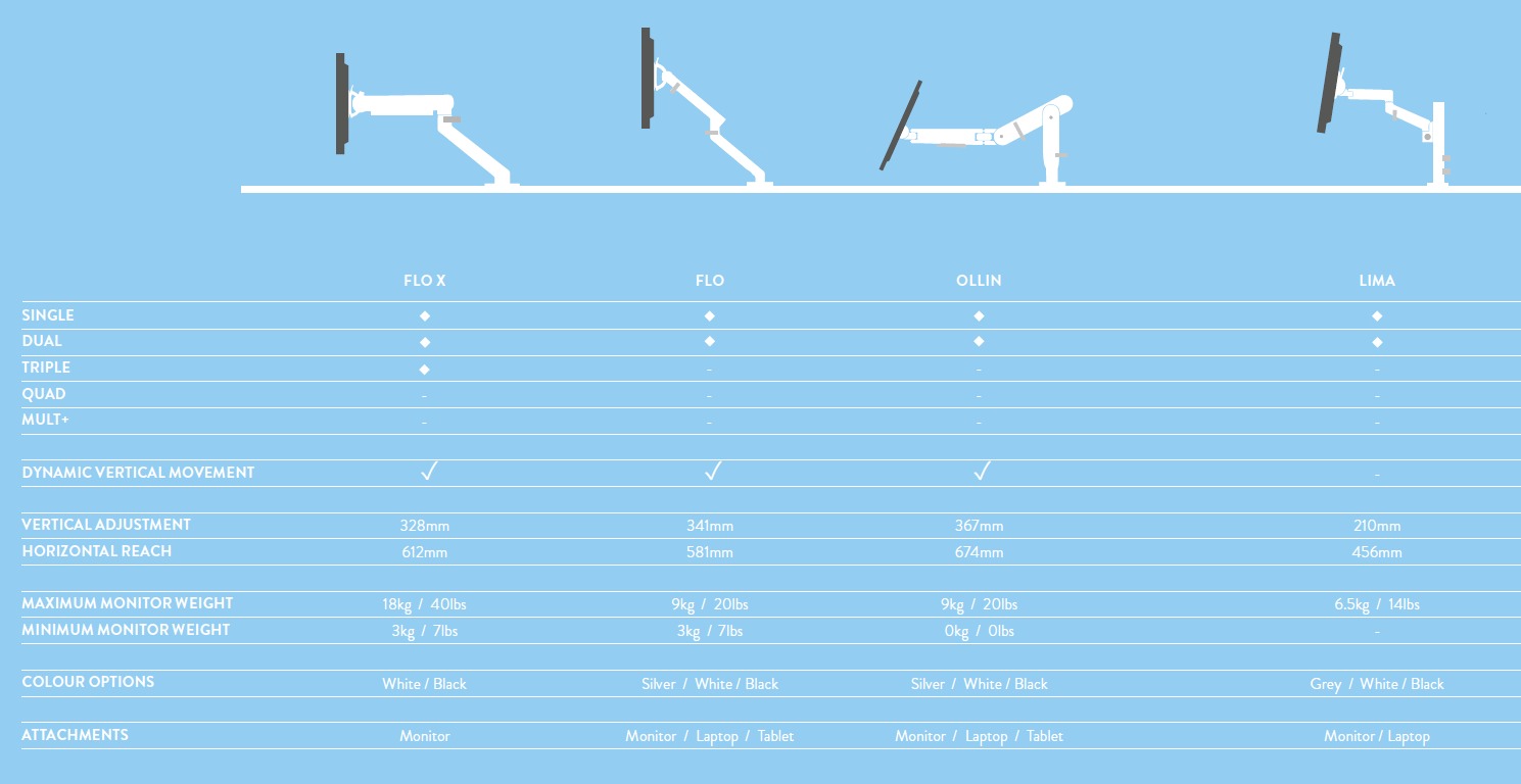 The technical cord that controls Ollin’s arm mean it can accommodate weights from 0kg up to 9kg. No other dynamic arm on the market can accommodate; tablets, monitors and laptops in this weight range.