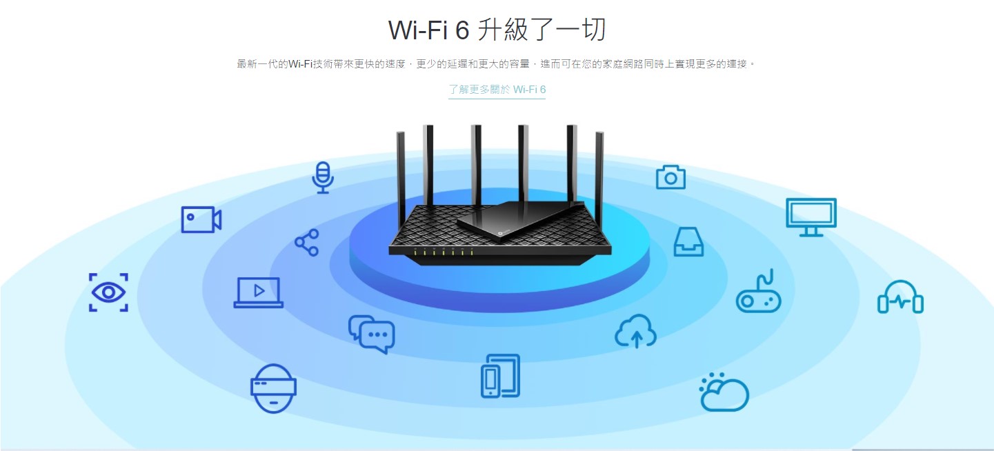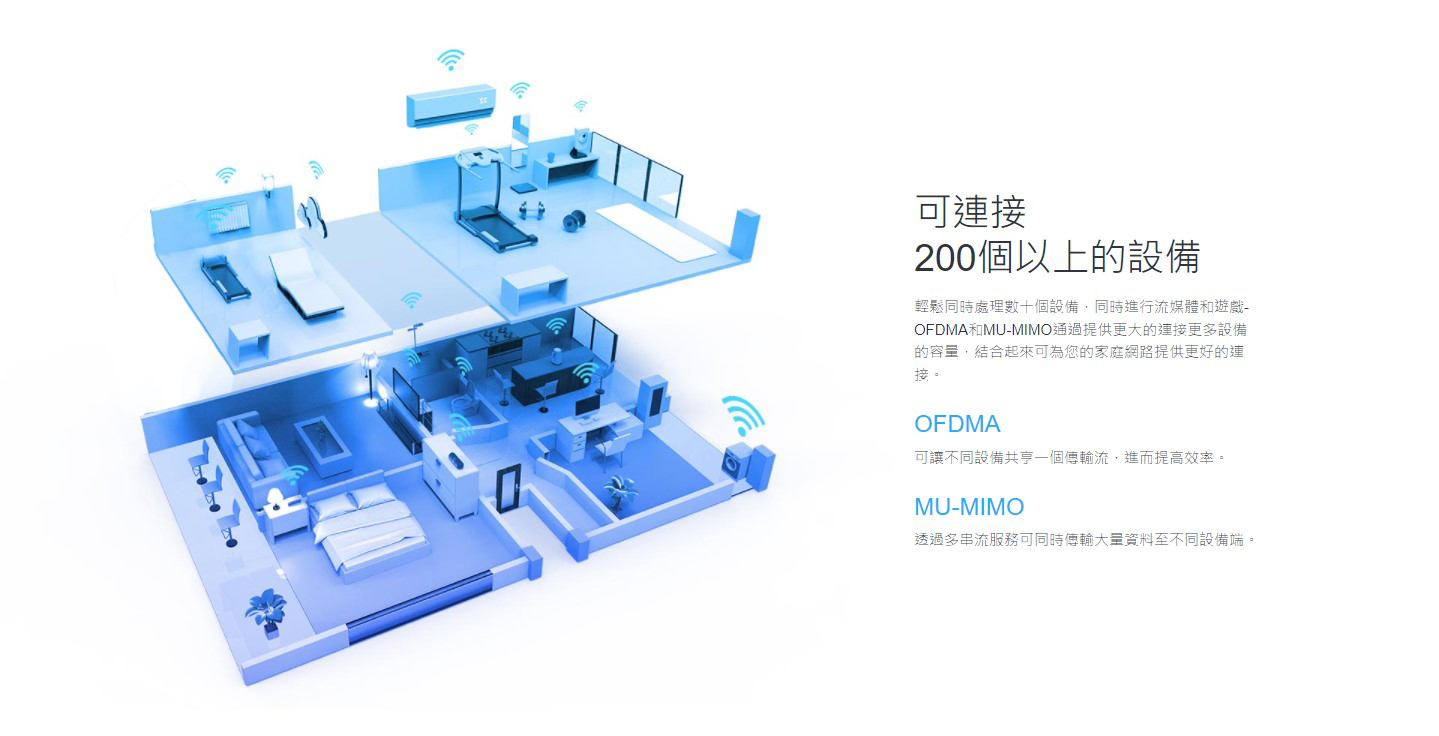 - 可連接更多設備並保持順暢的連線速度 – 支援 MU-MIMO 和 OFDMA 可減少網路壅擠並且能增加2倍的吞吐量.‡**
