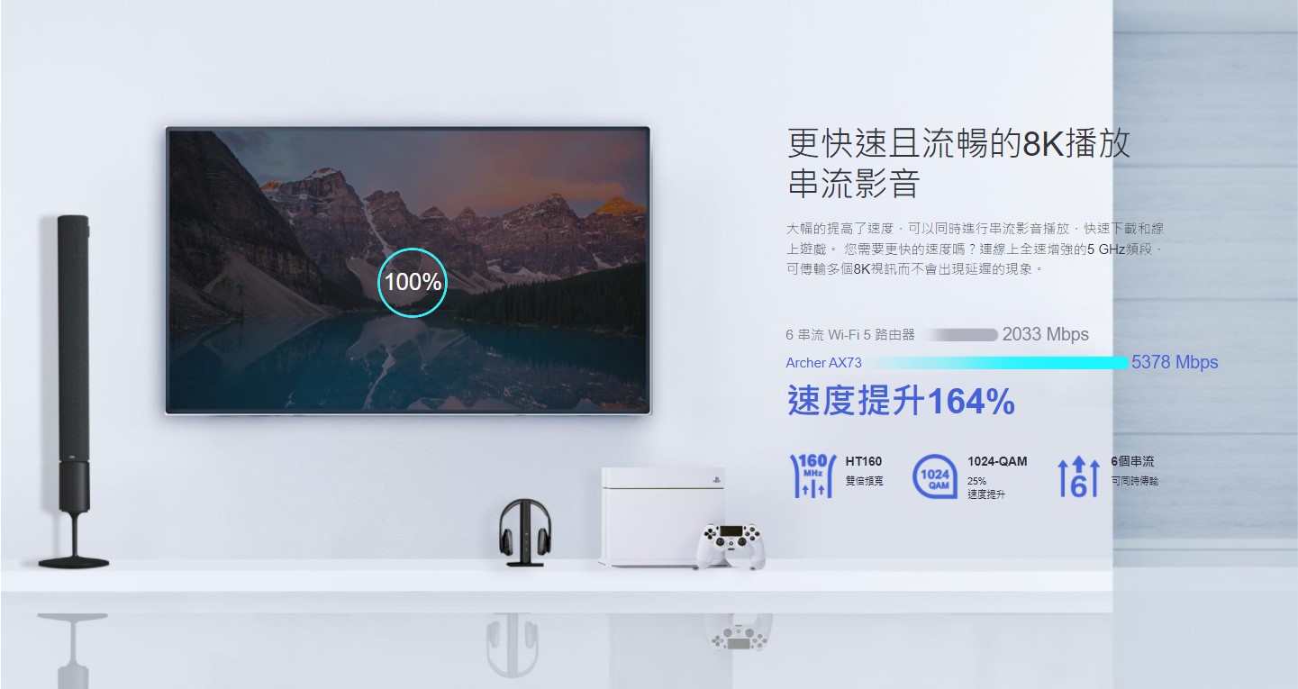 - Gigabit WiFi 提供 8K 串流 – 5400 Mbps WiFi 支援 4串流 160MHz,讓您可同時快速瀏覽網頁並同時下載檔案†