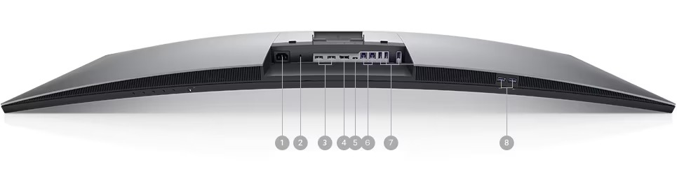 1. 交流電源連接器 | 2.安全鎖插槽 | 3.HDMI 連接埠連接器 | 4.DisplayPort 輸入連接器 | 5.USB Type-C 連接埠 | 6.USB 上行連接埠 | 7.USB 下行連接埠 | 8.USB 下行連接埠 (1 個,具備充電功能)