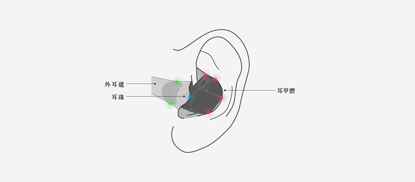 A4000以B series開發時所確立IEM耳機最適合的機體設計基礎上所設計,實現了無與論比的佩戴感。耳機的佩戴感優劣與否,取決於壓迫感。標榜人體工學外觀等,利用矽膠的反作用力去維持的方法乍聽下好像是不錯的方式,但長時間在耳朵上施加壓力,不知不覺中就對耳朵造成無形的負擔,累積疲勞感。比起大面積接觸耳朵的方式,限定接觸面積的範圍及形狀,以達成無壓迫感的佩戴感受做為目標。A4000的本體經由下述3點去維持整體的安定的佩戴感。下面的圖中粉紅色的部分(耳殼)範圍其中的任一點,綠色部分(耳套)的1點,藍色部分(耳珠)的1點,合計共3點。以此方式,更能更普遍適合各色的耳型。接觸的點完全沒有壓迫感的話,即能感受到無與論比的佩戴感,就像是客製化耳機甚至比客製化耳機更為來得舒適的感受。